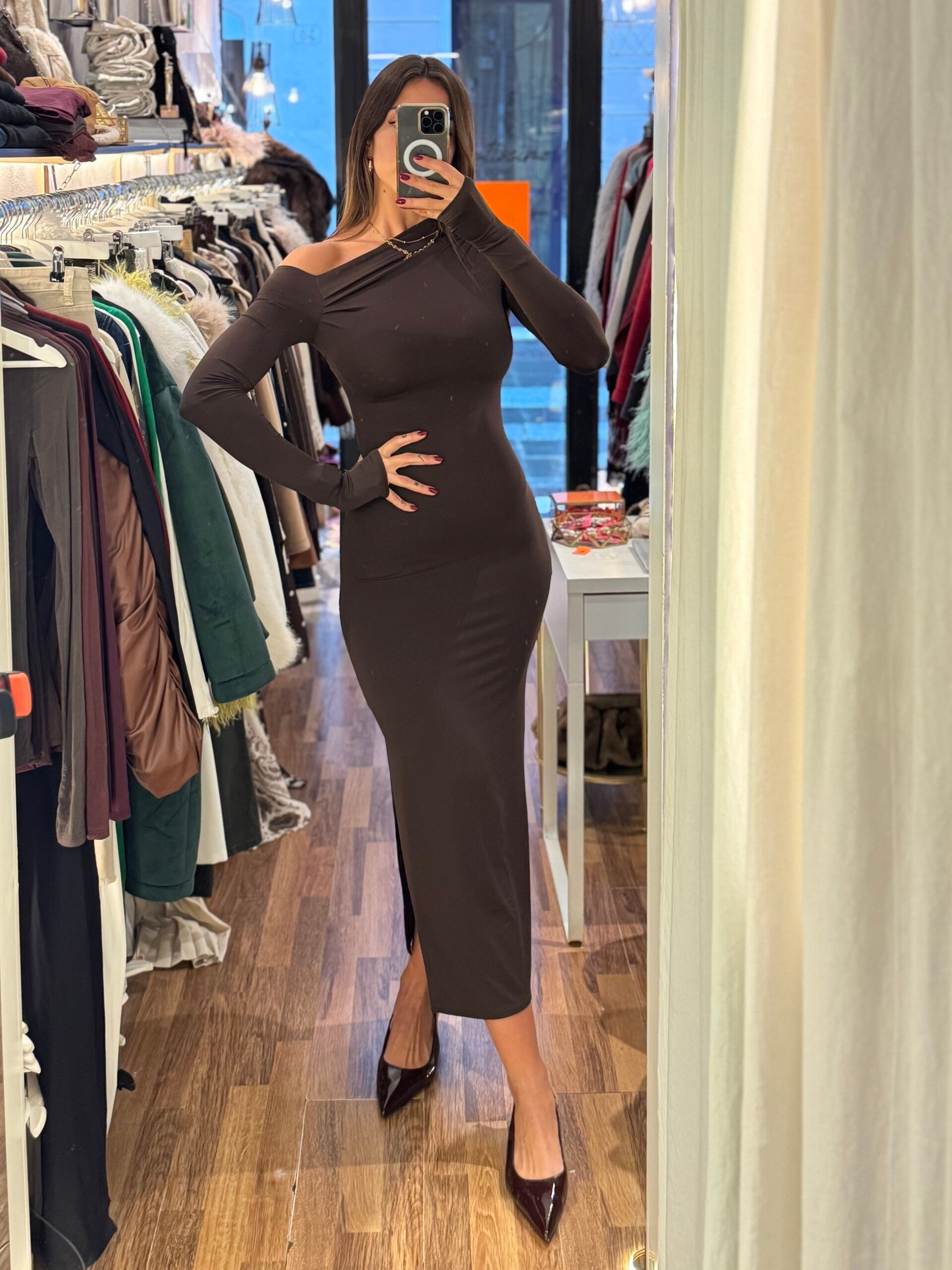 abito con scollo asimmetrico e manica con buco stile 'manicotto', veste aderente ma è molto elasticizzato