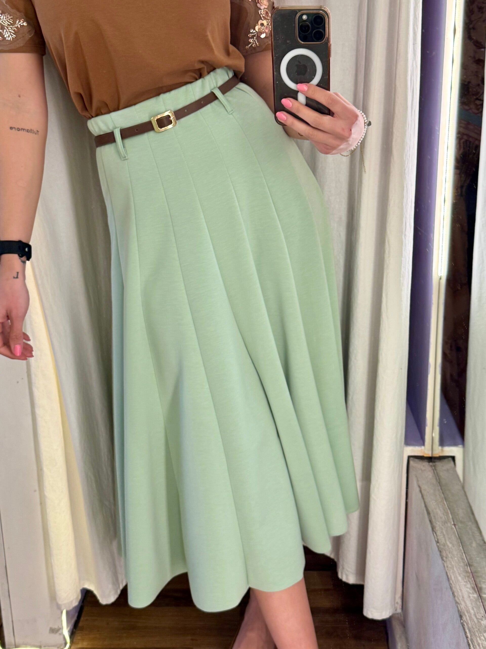 Gonna midi nella raffinata tonalità verde menta, caratterizzata da una linea fluida e femminile che accompagna i movimenti con eleganza.