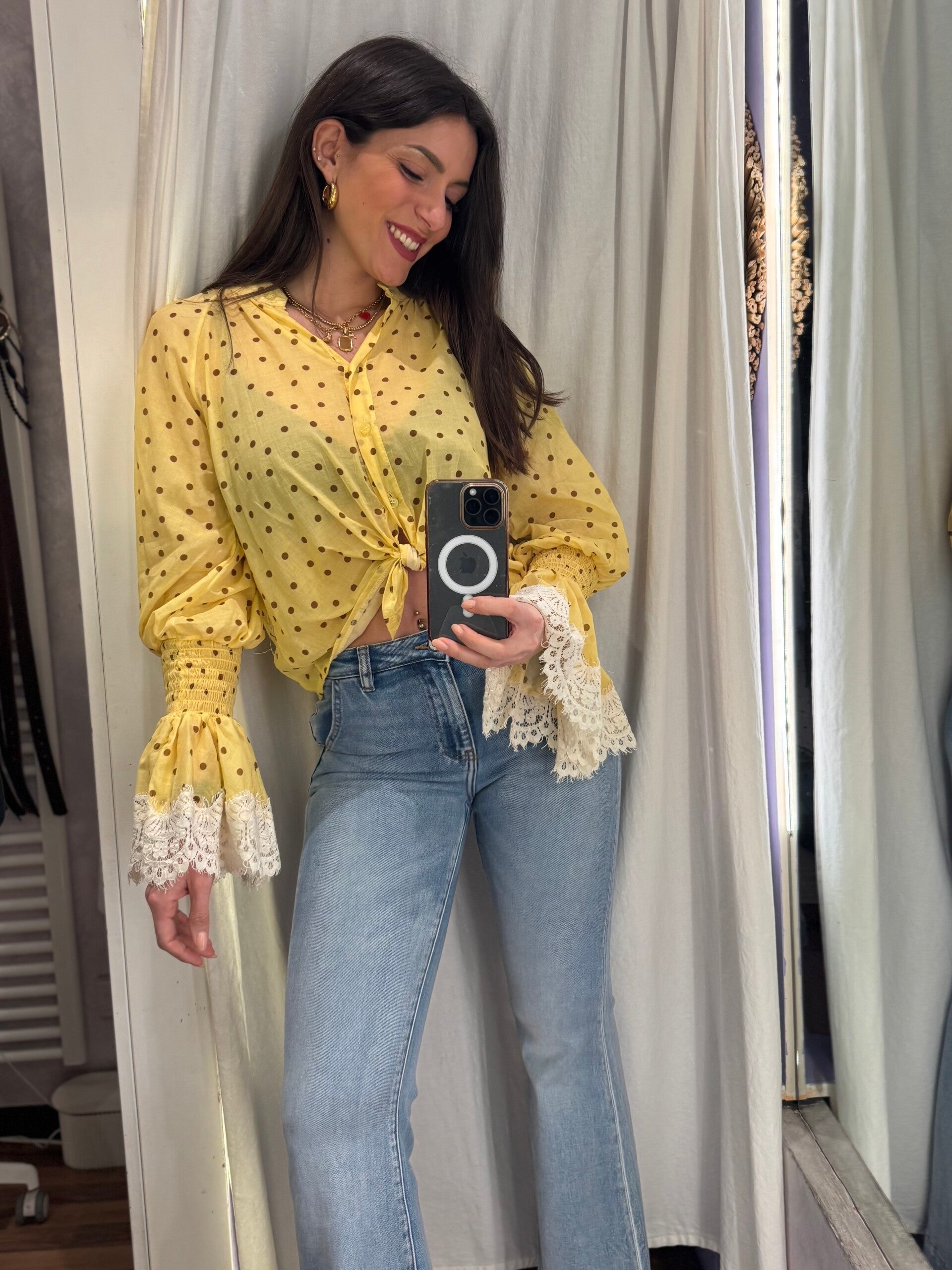 Camicia femminile in tessuto leggero e velato, caratterizzata da delicati pois e romantici dettagli in pizzo sulle maniche.