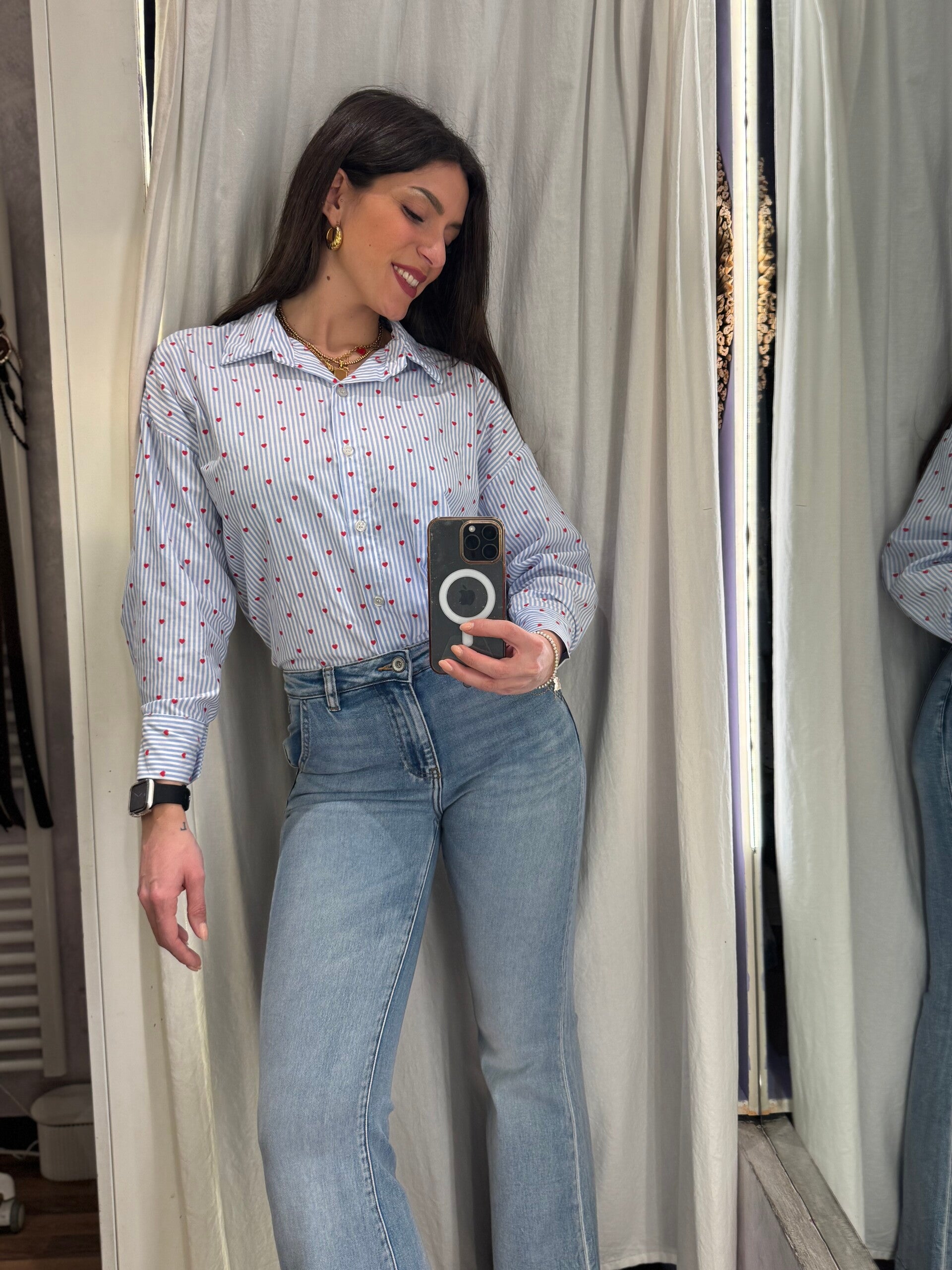 Camicia dal design romantico con righe sottili e piccoli cuori ricamati che donano un tocco originale al look.