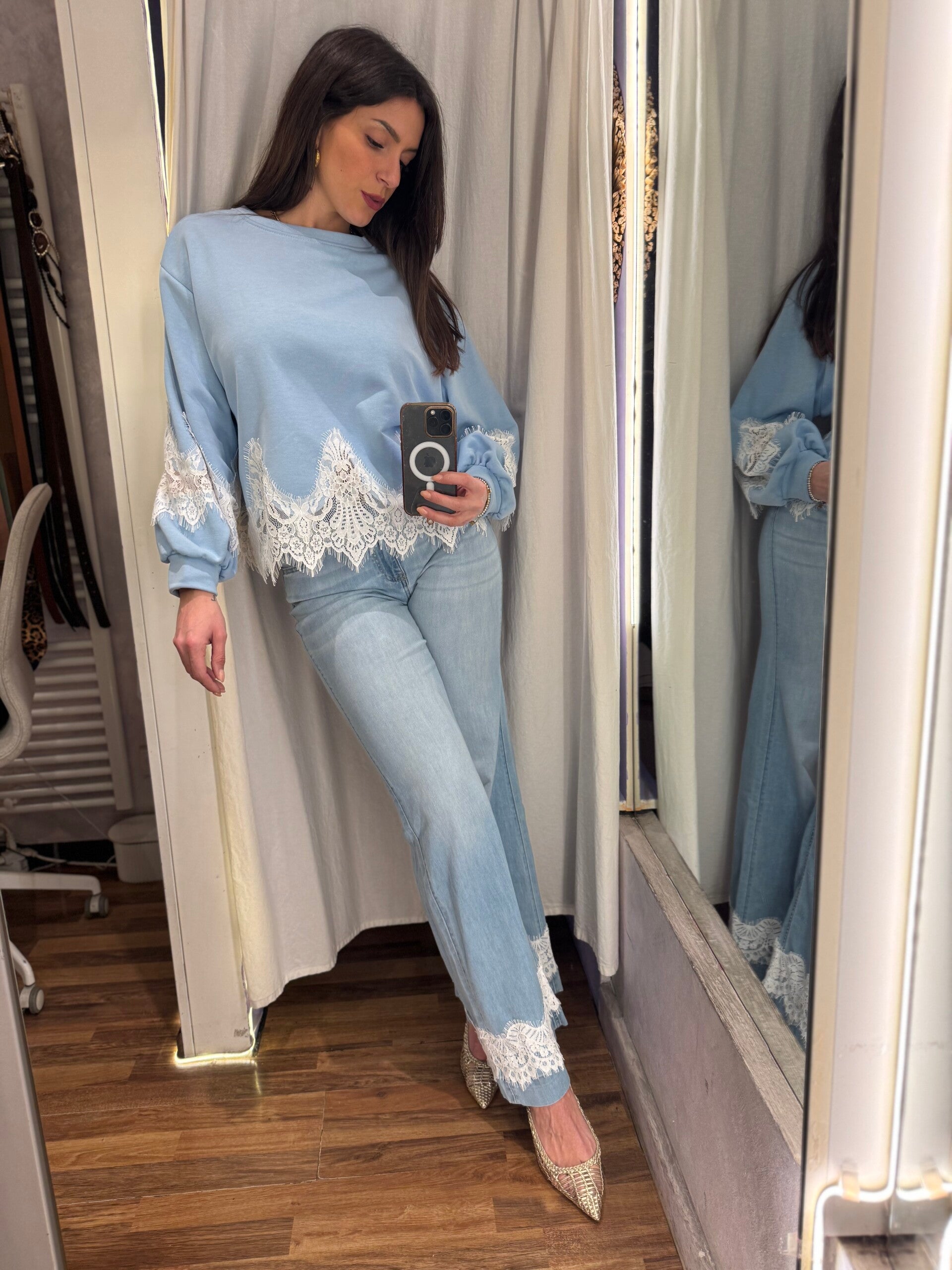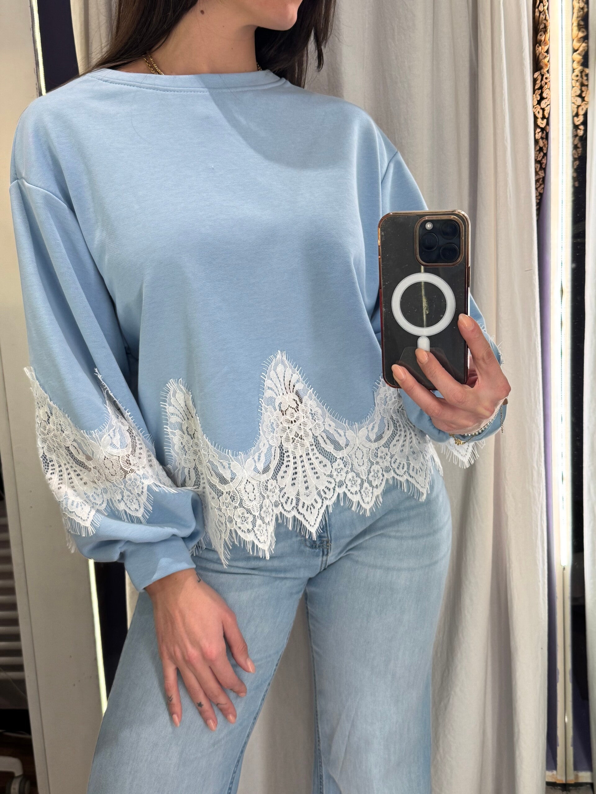 Felpa dal taglio morbido nella delicata tonalità azzurro cielo, impreziosita da un elegante inserto in pizzo sul fondo che dona femminilità e raffinatezza al capo.