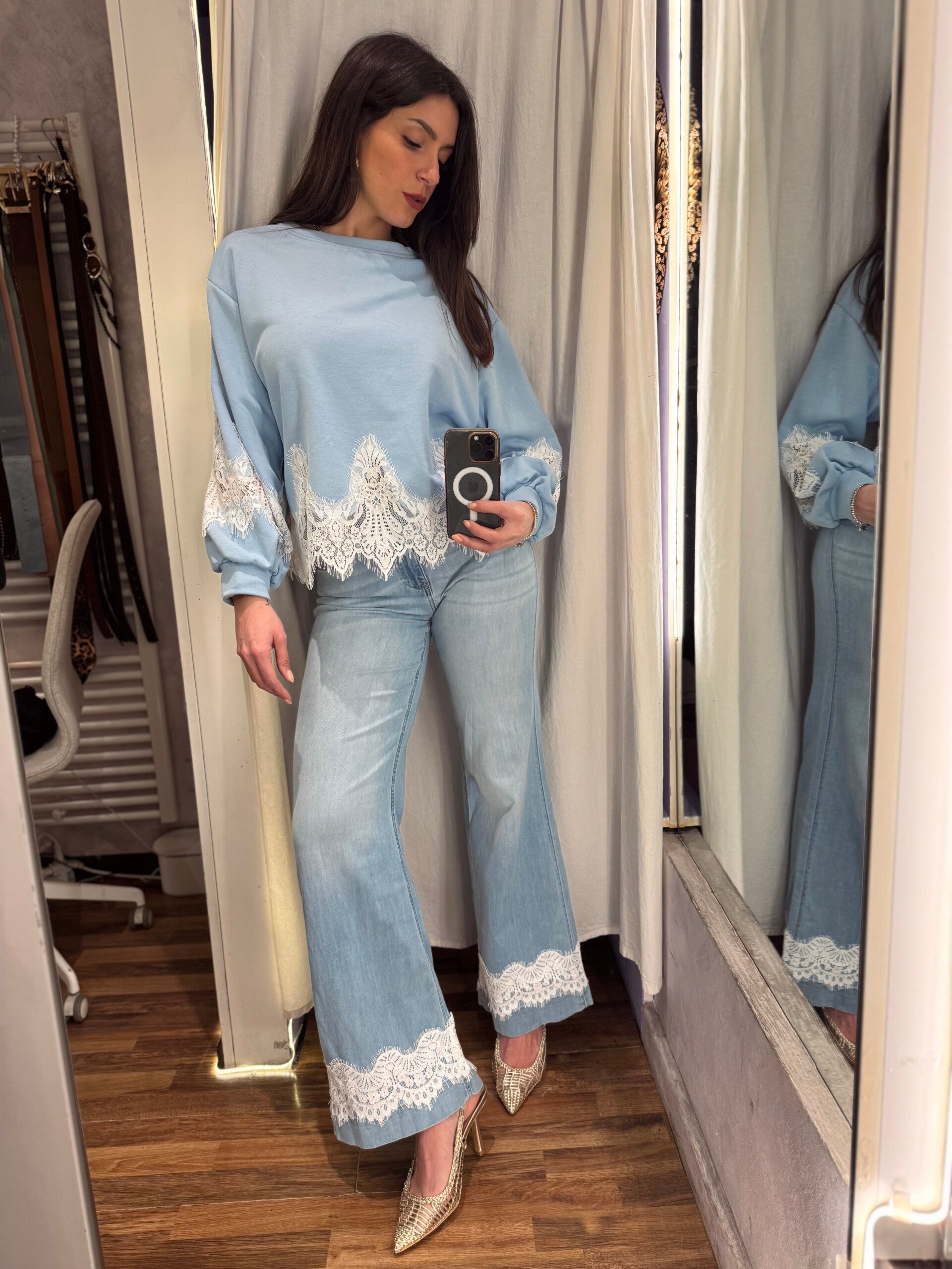 Jeans dal lavaggio chiarissimo con gamba ampia impreziositi da un raffinato dettaglio in pizzo sul fondo.