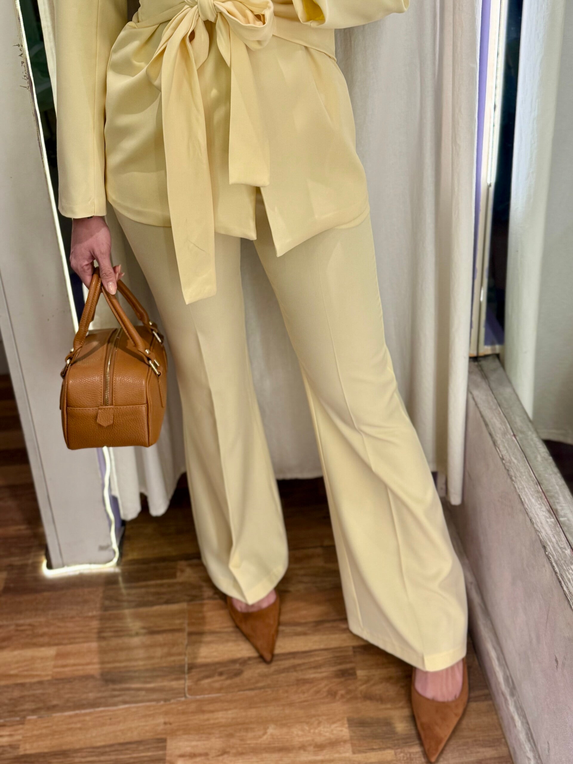 Elegante tailleur dal taglio femminile nella raffinata tonalità giallo burro.