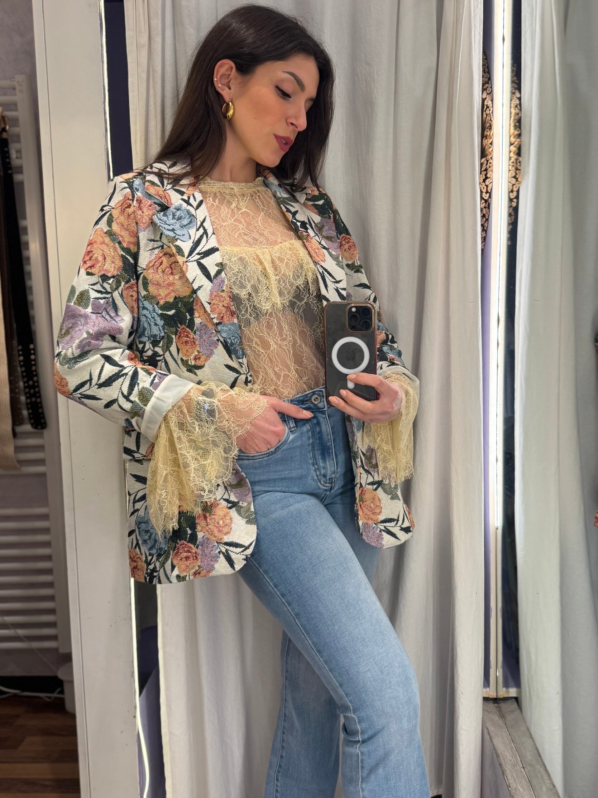 Blazer dal fascino romantico con raffinata fantasia floreale.