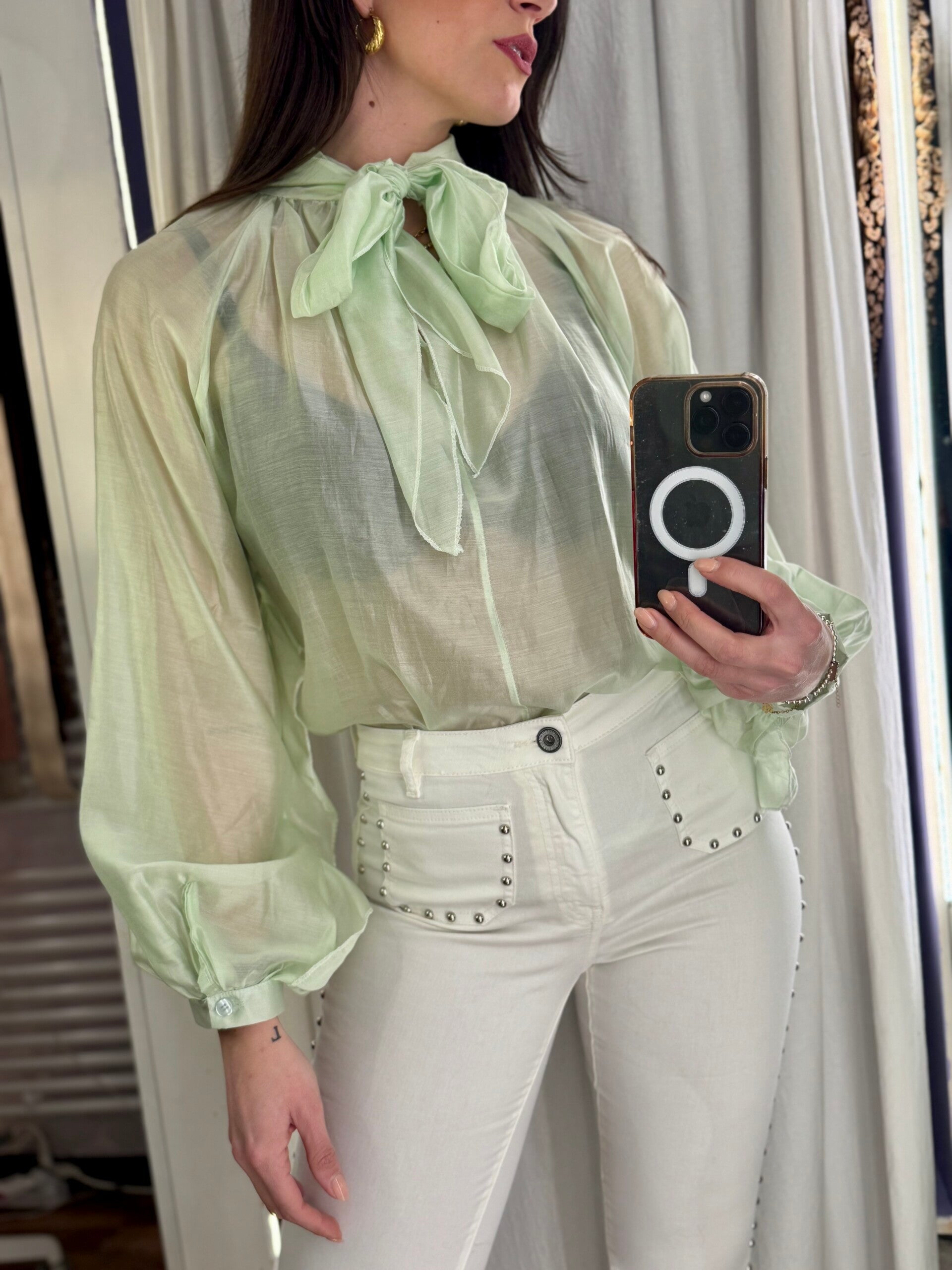 Camicia elegante in tessuto leggermente velato, impreziosita da un raffinato fiocco al collo che dona femminilità al look.