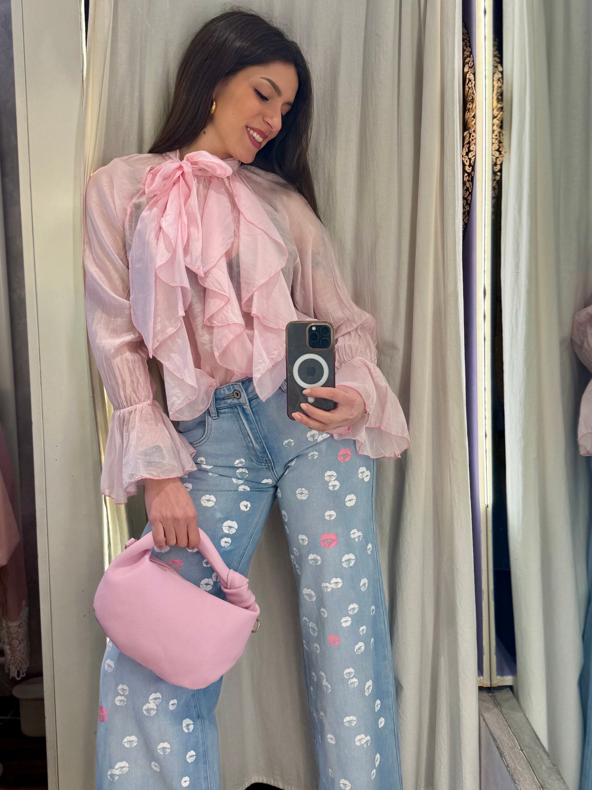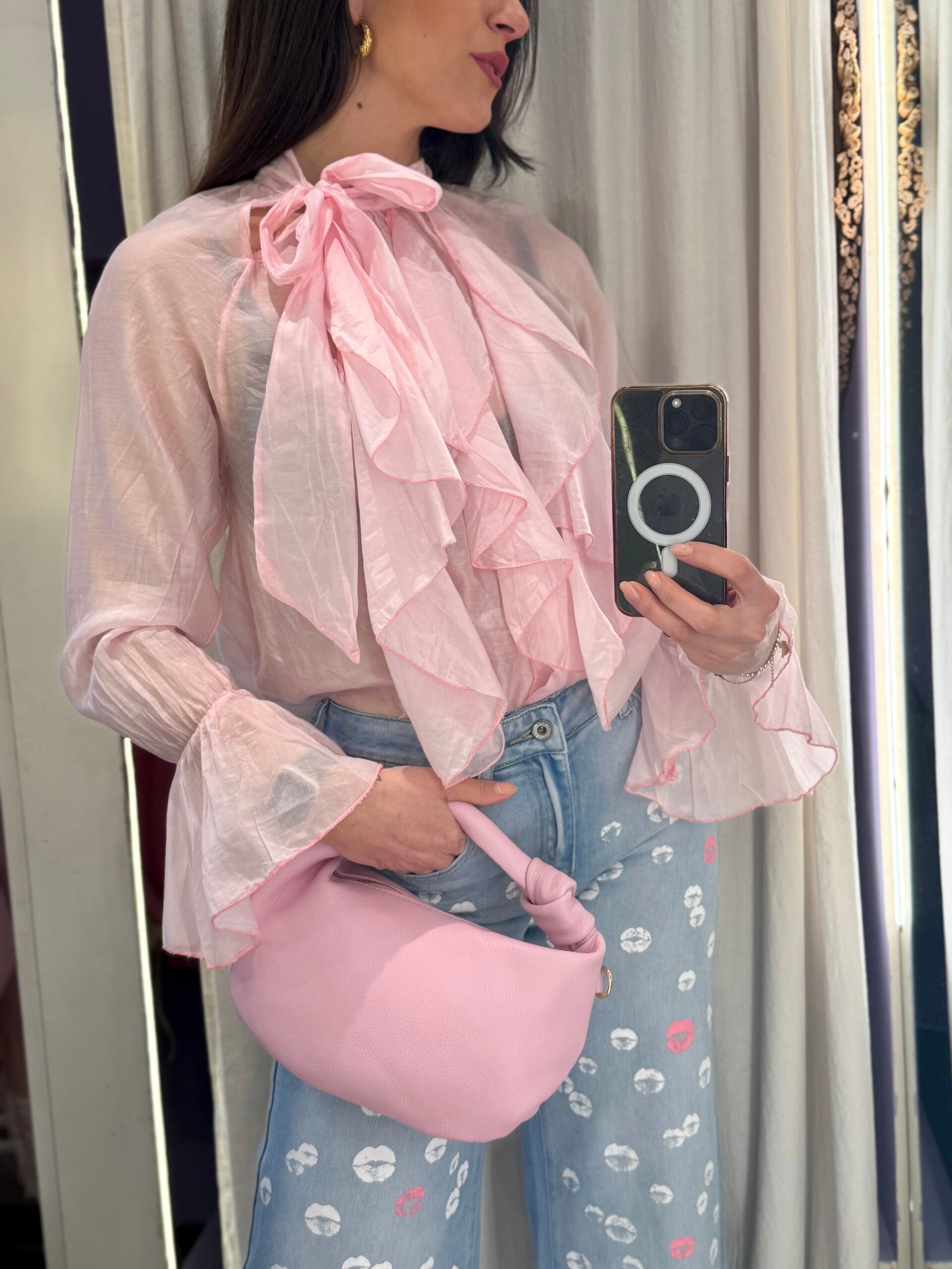 Camicia femminile in tessuto leggero e velato, impreziosita da romantiche rouches e fiocco al collo.