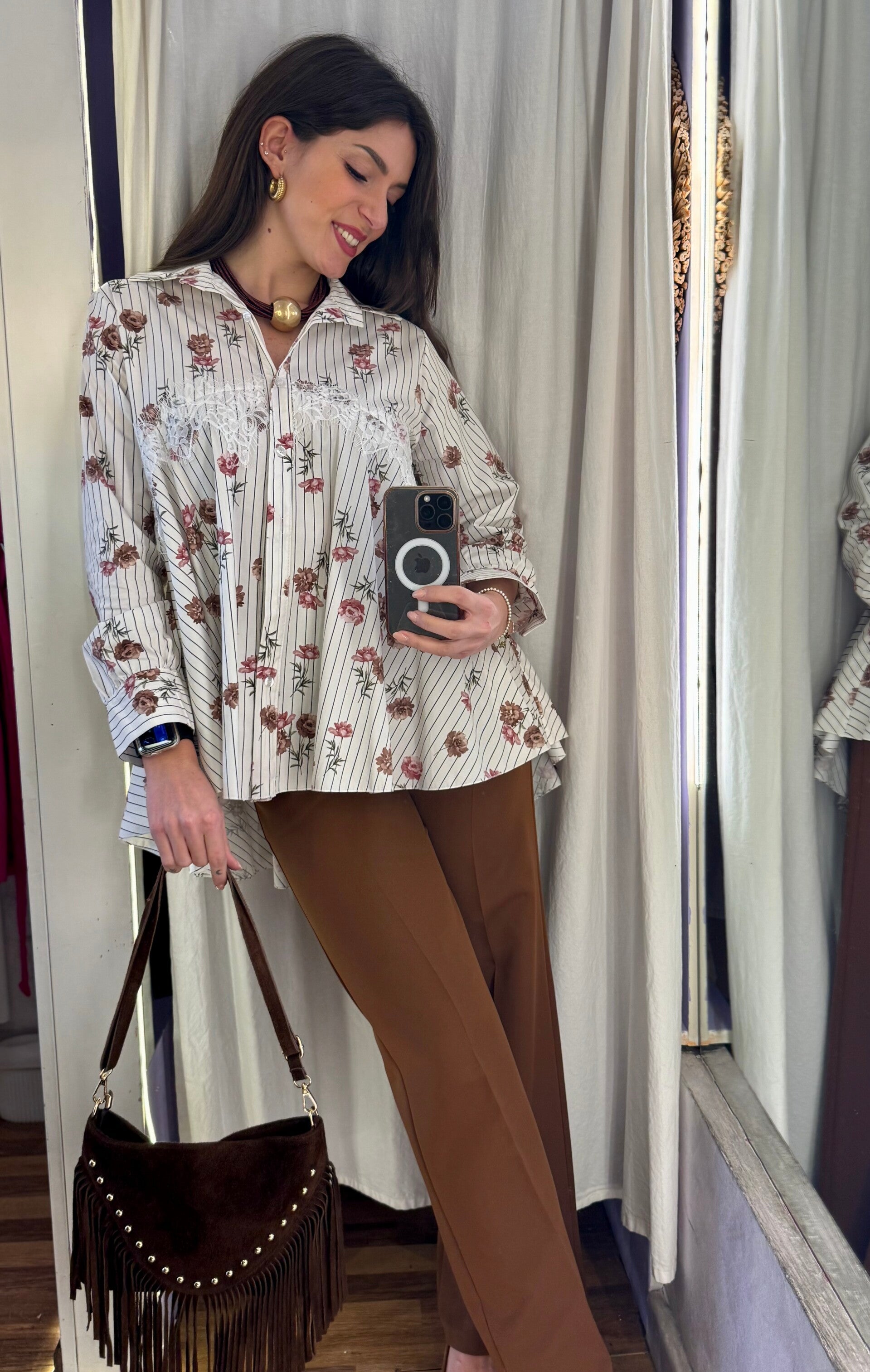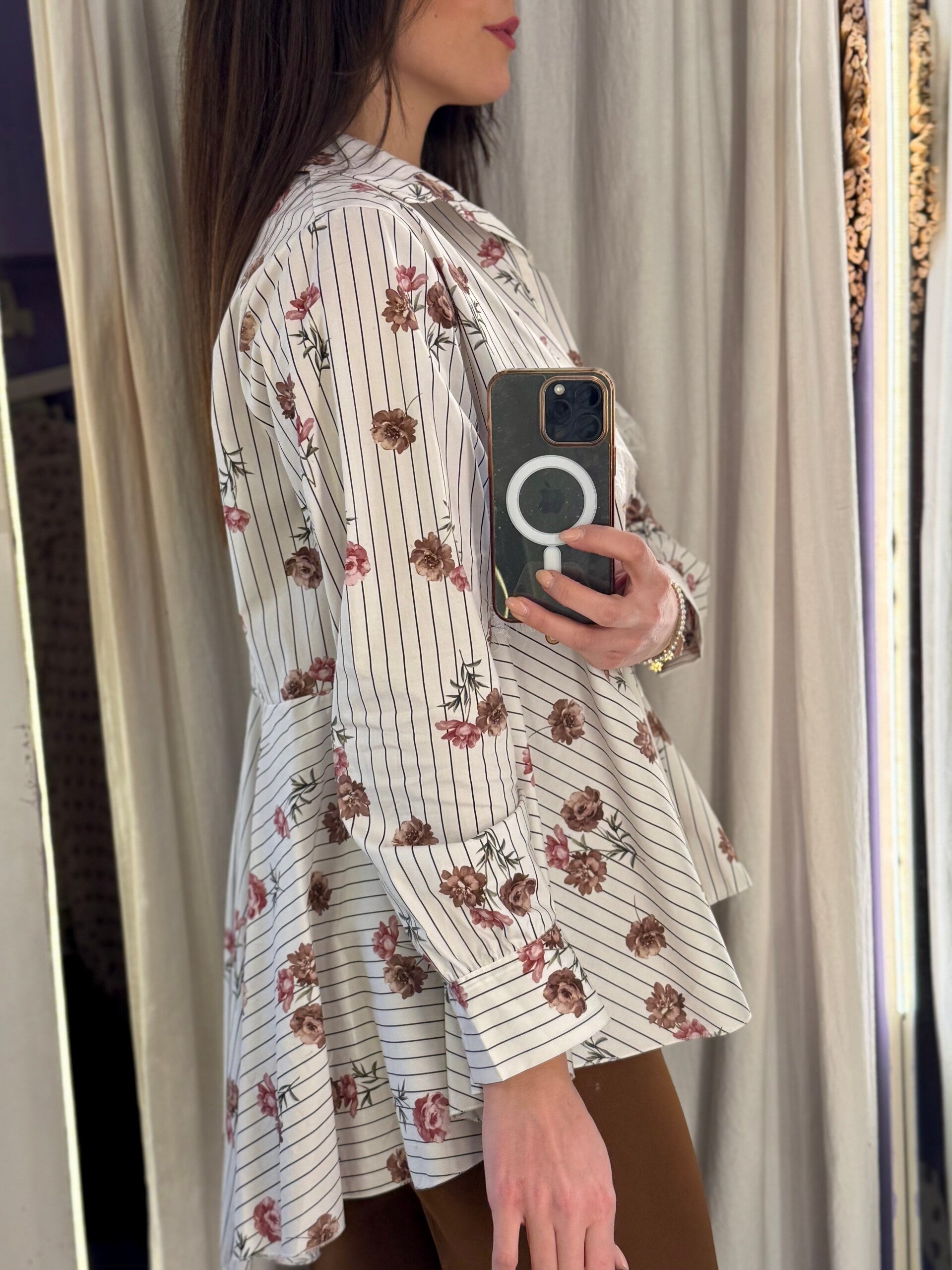 Realizzata in tessuto leggero con delicata stampa floreale su fondo rigato, questa camicia si distingue per gli inserti in pizzo sul décolleté che donano un tocco sofisticato e ricercato.
