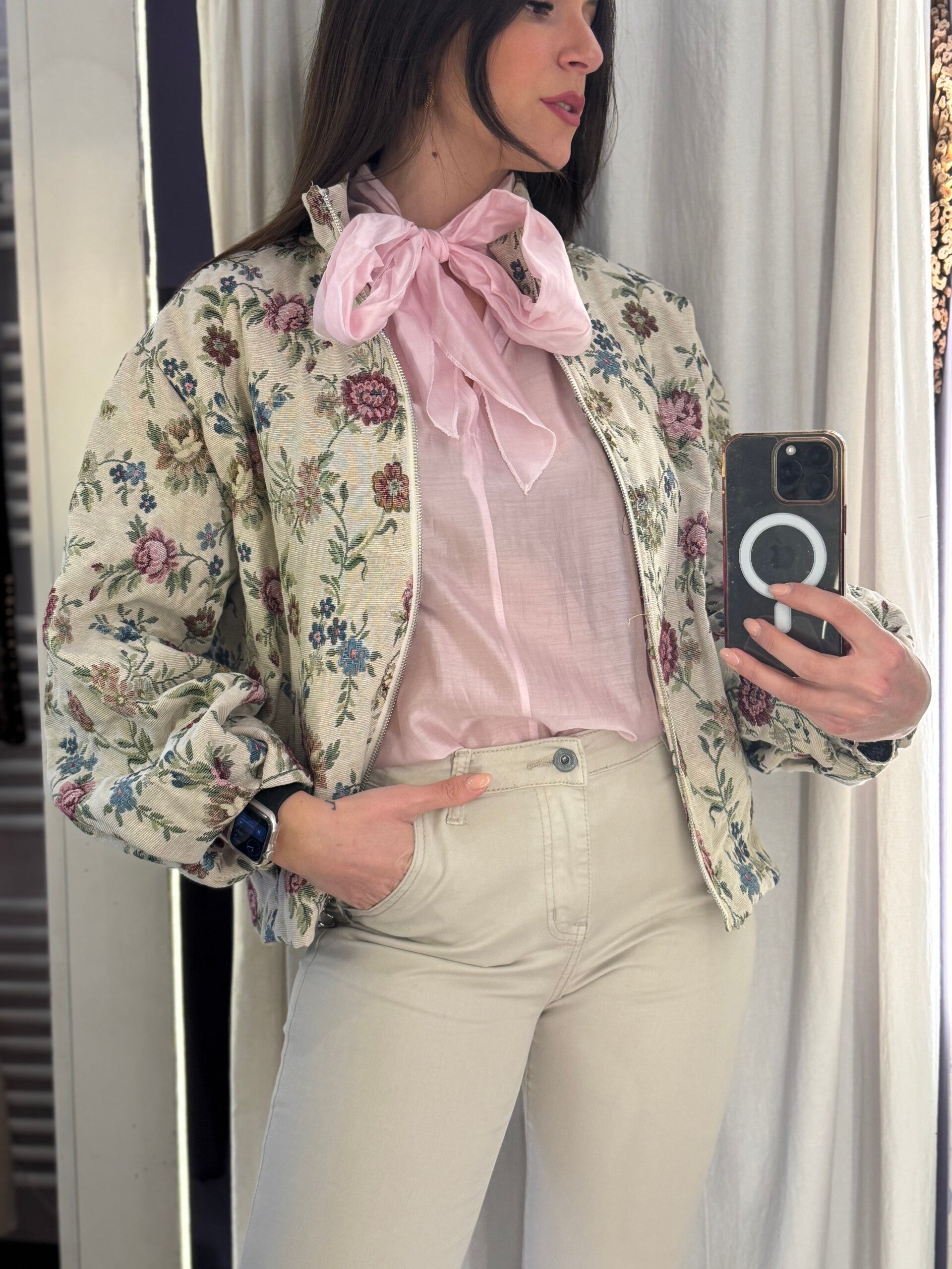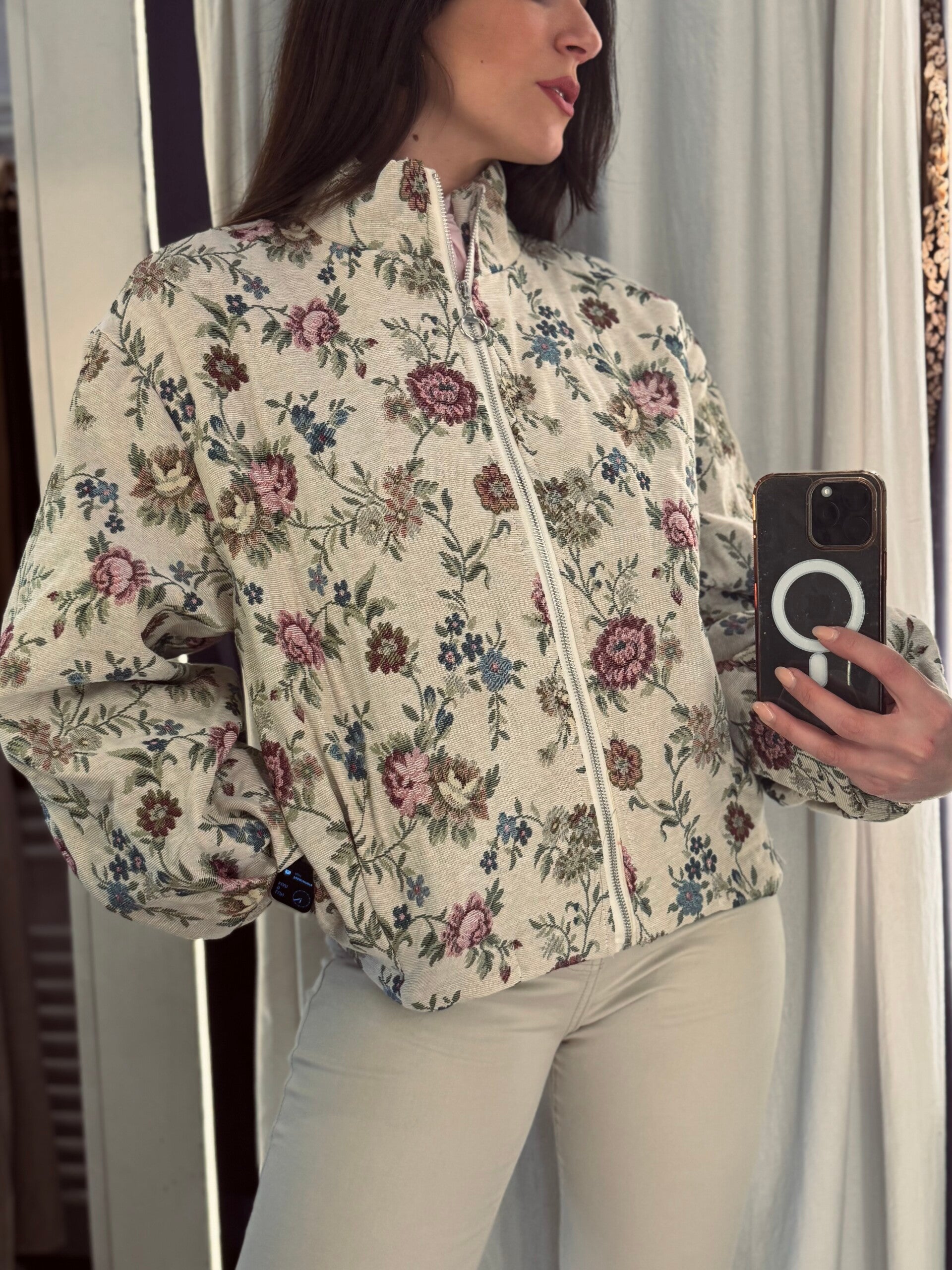 Realizzato con stampa floreale dal gusto vintage, presenta una linea morbida e una chiusura frontale con zip che la rende pratica e versatile. Il tessuto strutturato valorizza il design e dona al capo un carattere elegante e originale.