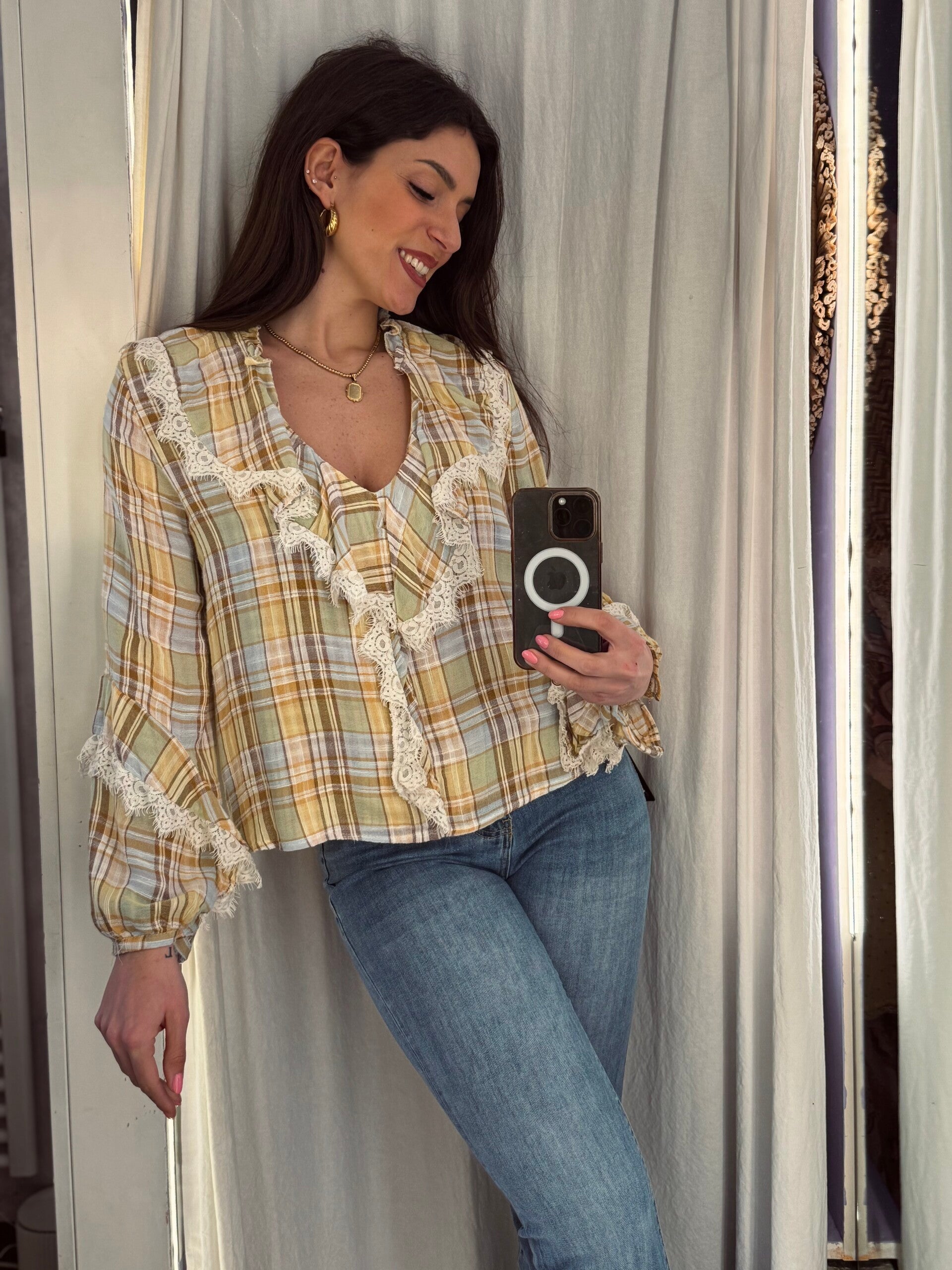 Blusa leggera con fantasia a quadri nei toni caldi del giallo e impreziosita da delicati inserti in pizzo. La vestibilità morbida e i dettagli romantici la rendono perfetta per look femminili e luminosi.