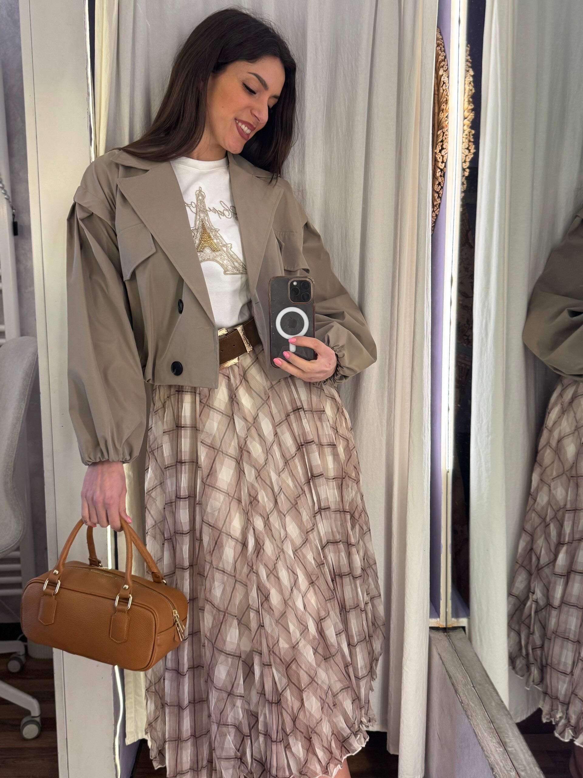 Gonna midi leggera con delicata fantasia check nei toni del beige e del mocha. Il tessuto fluido e il movimento morbido la rendono perfetta per look eleganti ma contemporanei.