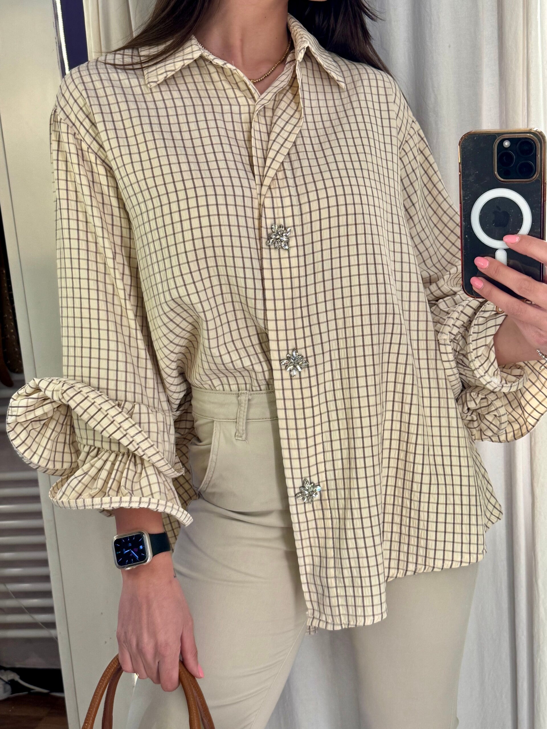 Camicia dal fascino raffinato con delicata fantasia a quadri e dettagli gioiello sui bottoni che illuminano il capo. Le maniche ampie con volant donano movimento e rendono il look elegante ma originale.