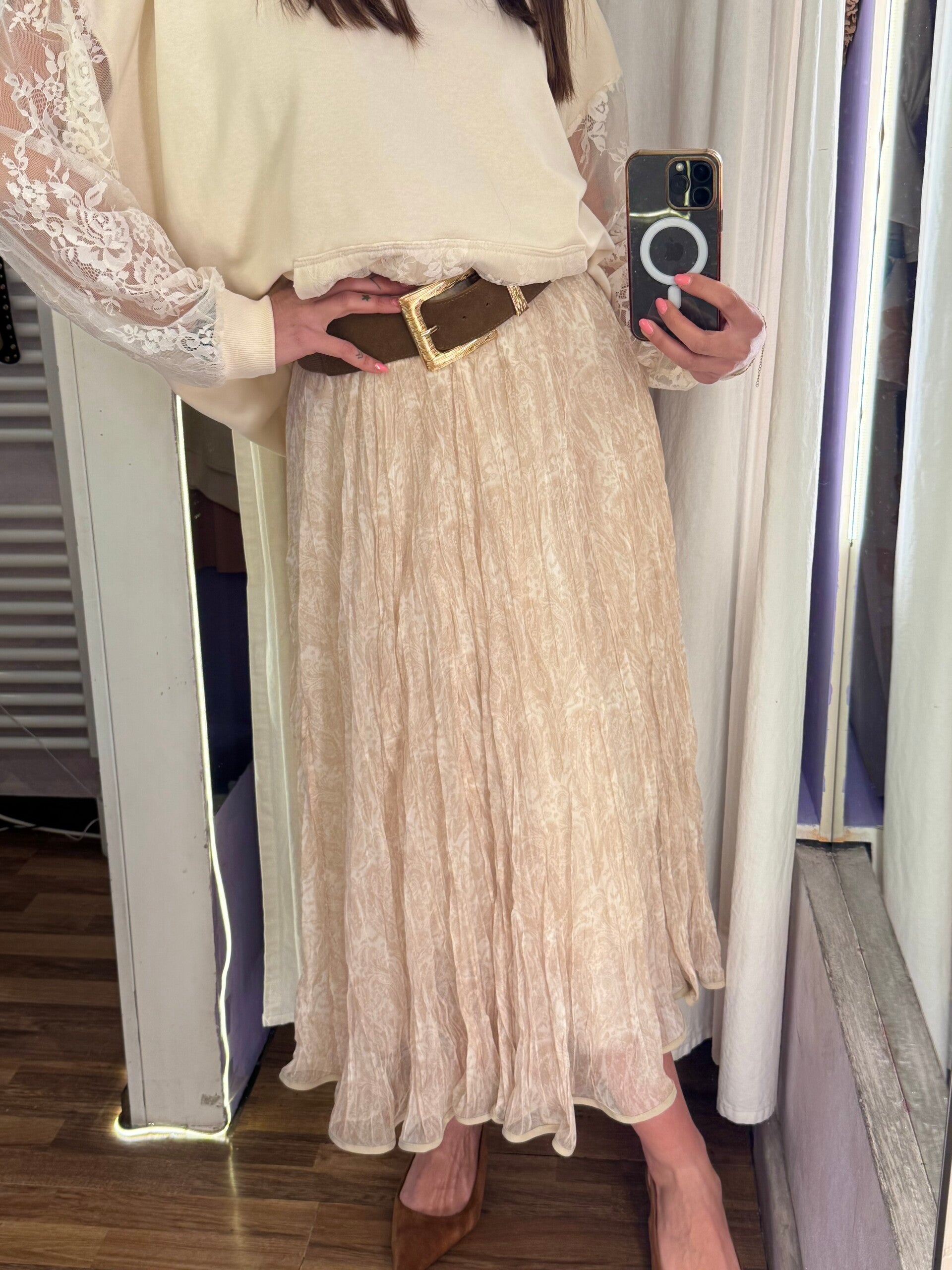 Gonna midi dal tessuto leggero e fluido con delicato effetto plissé. Perfetta per creare look eleganti e femminili, ideale sia per il giorno che per occasioni più raffinate.