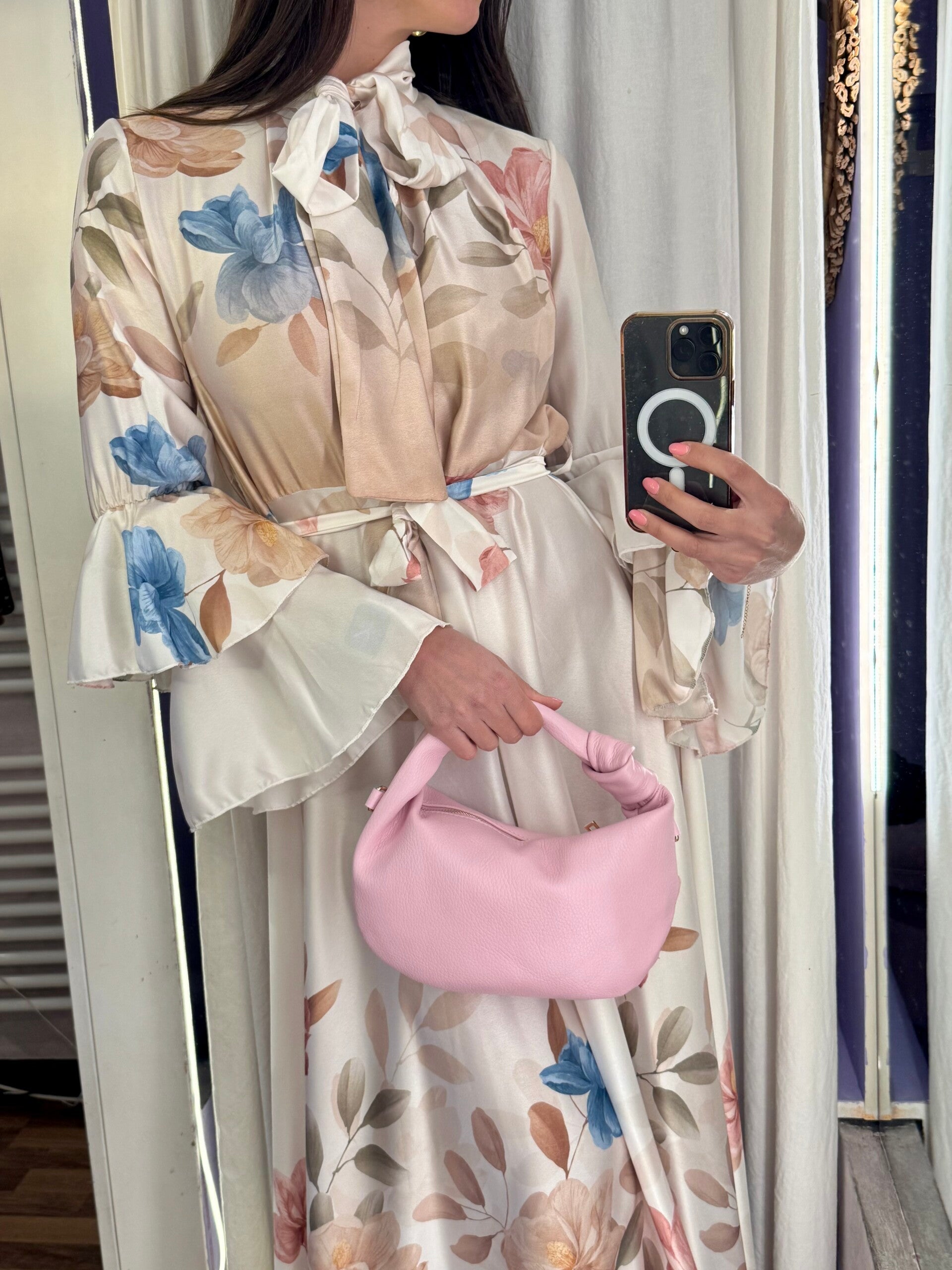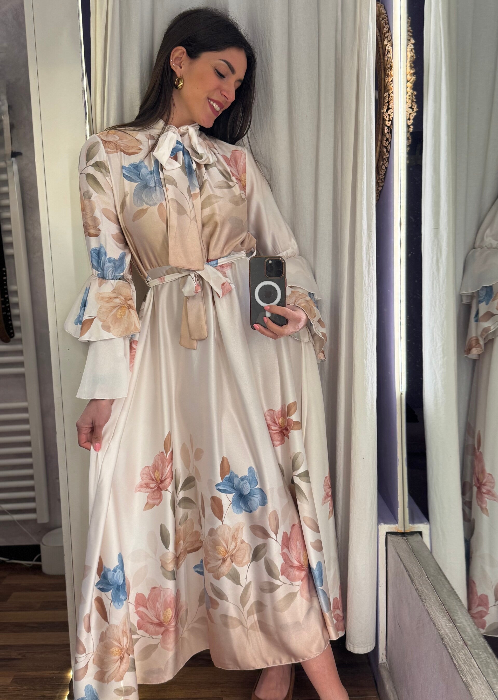 Abito lungo con delicata fantasia floreale nei toni pastello, caratterizzato da fiocco al collo e cintura in vita che valorizza la figura. Le maniche con volant donano movimento e un tocco romantico.