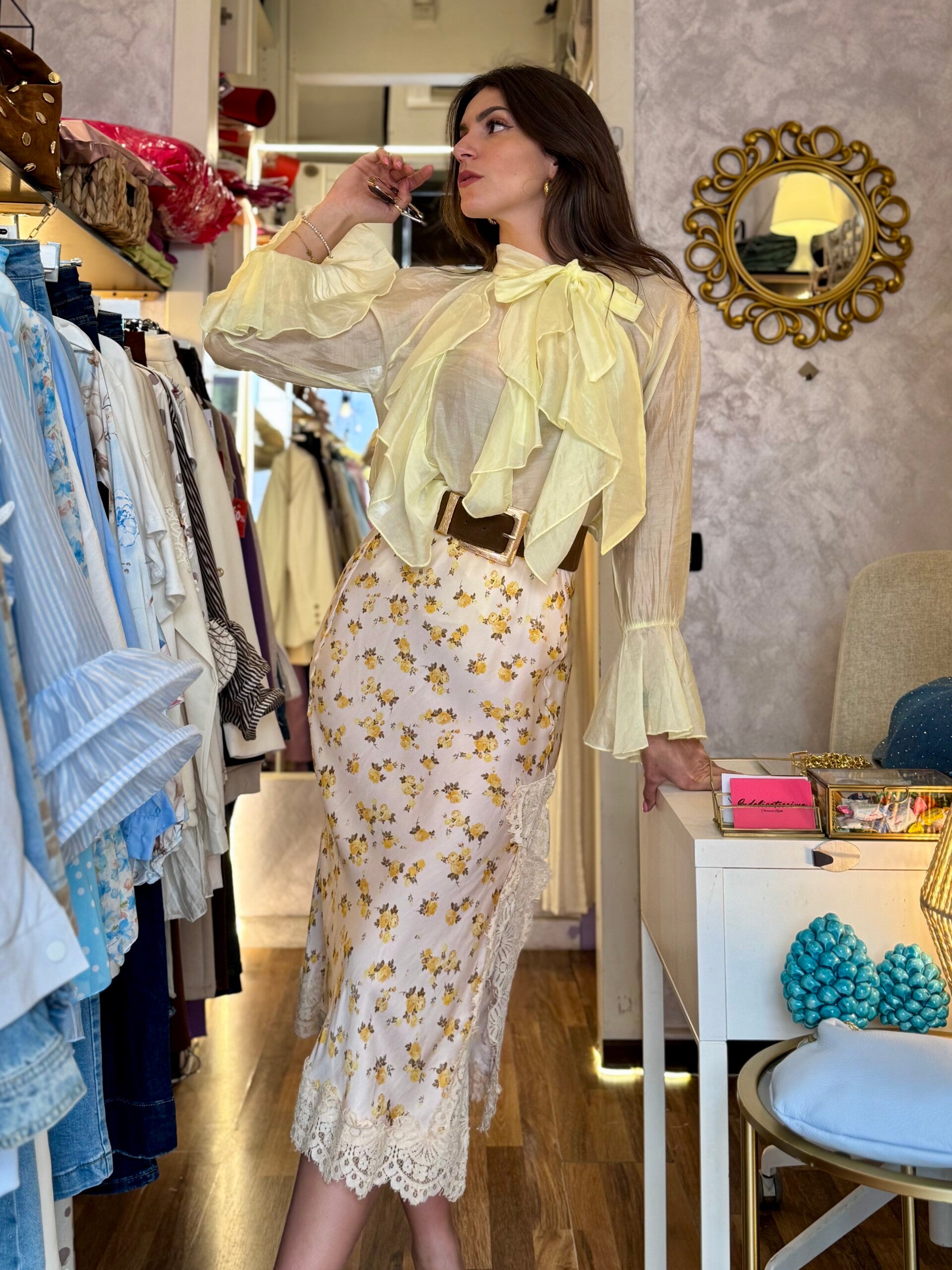 Blusa leggera e luminosa con ruches e fiocco, dal mood romantico.