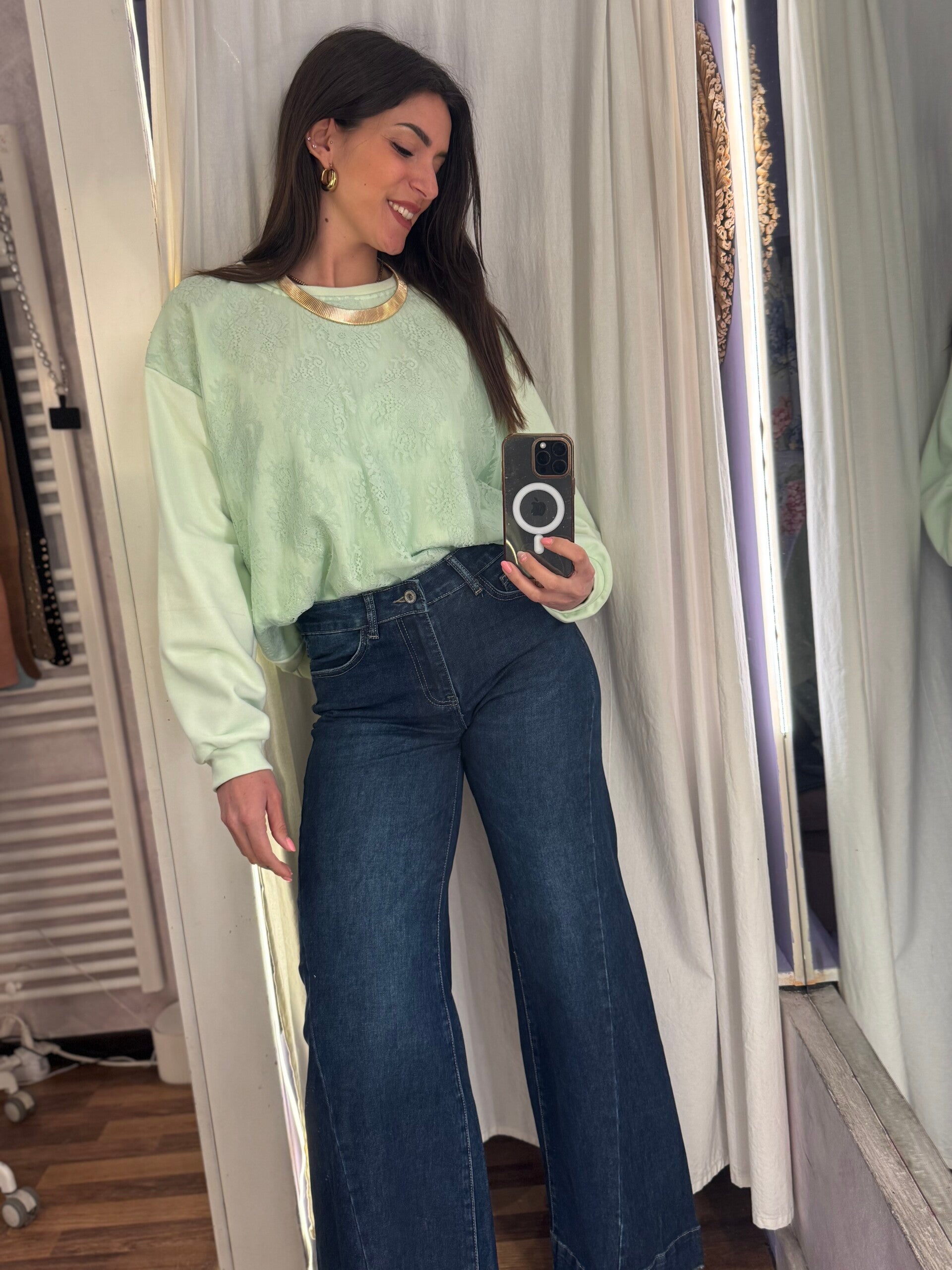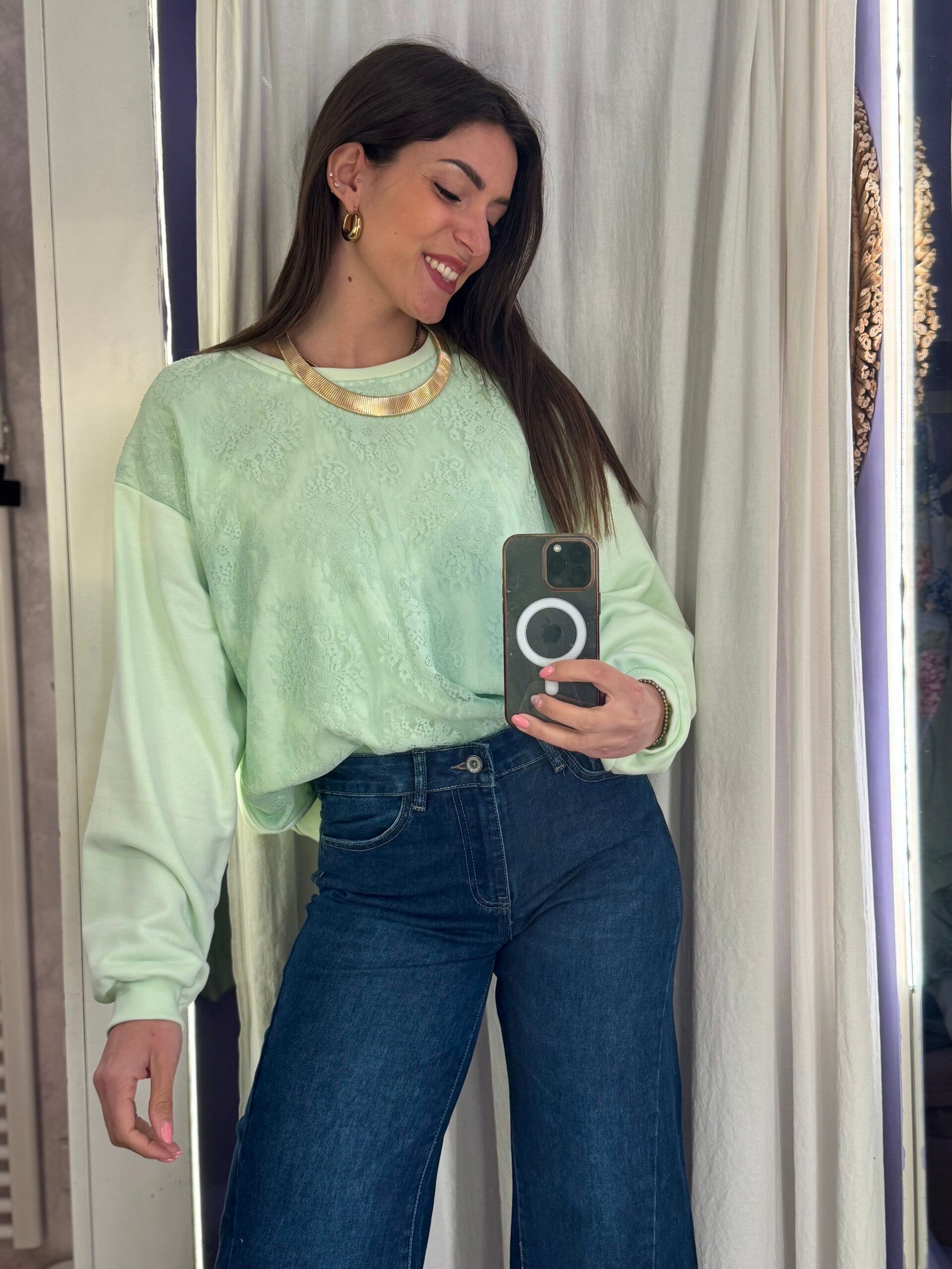 Felpa raffinata con dettagli in pizzo tono su tono.