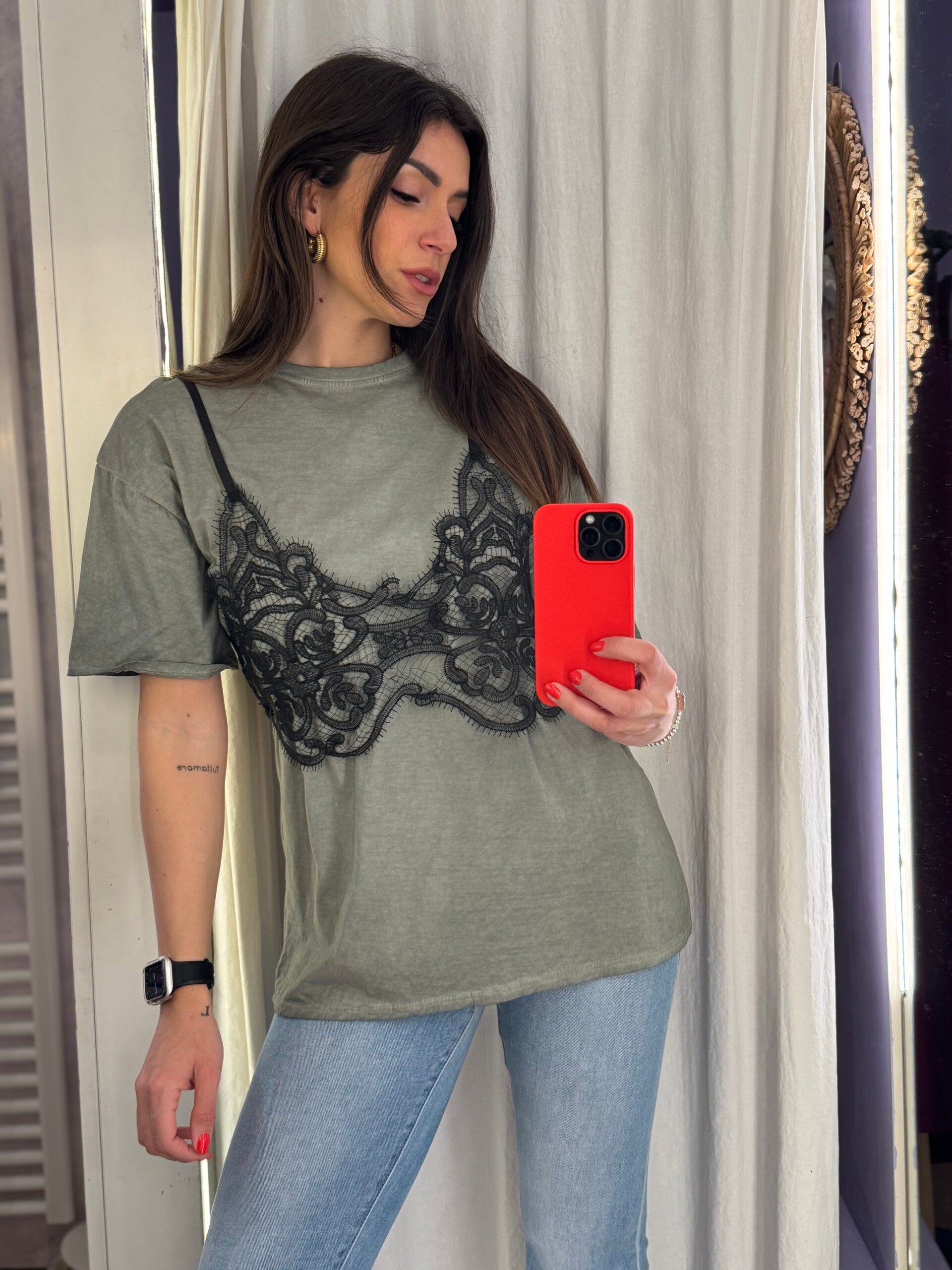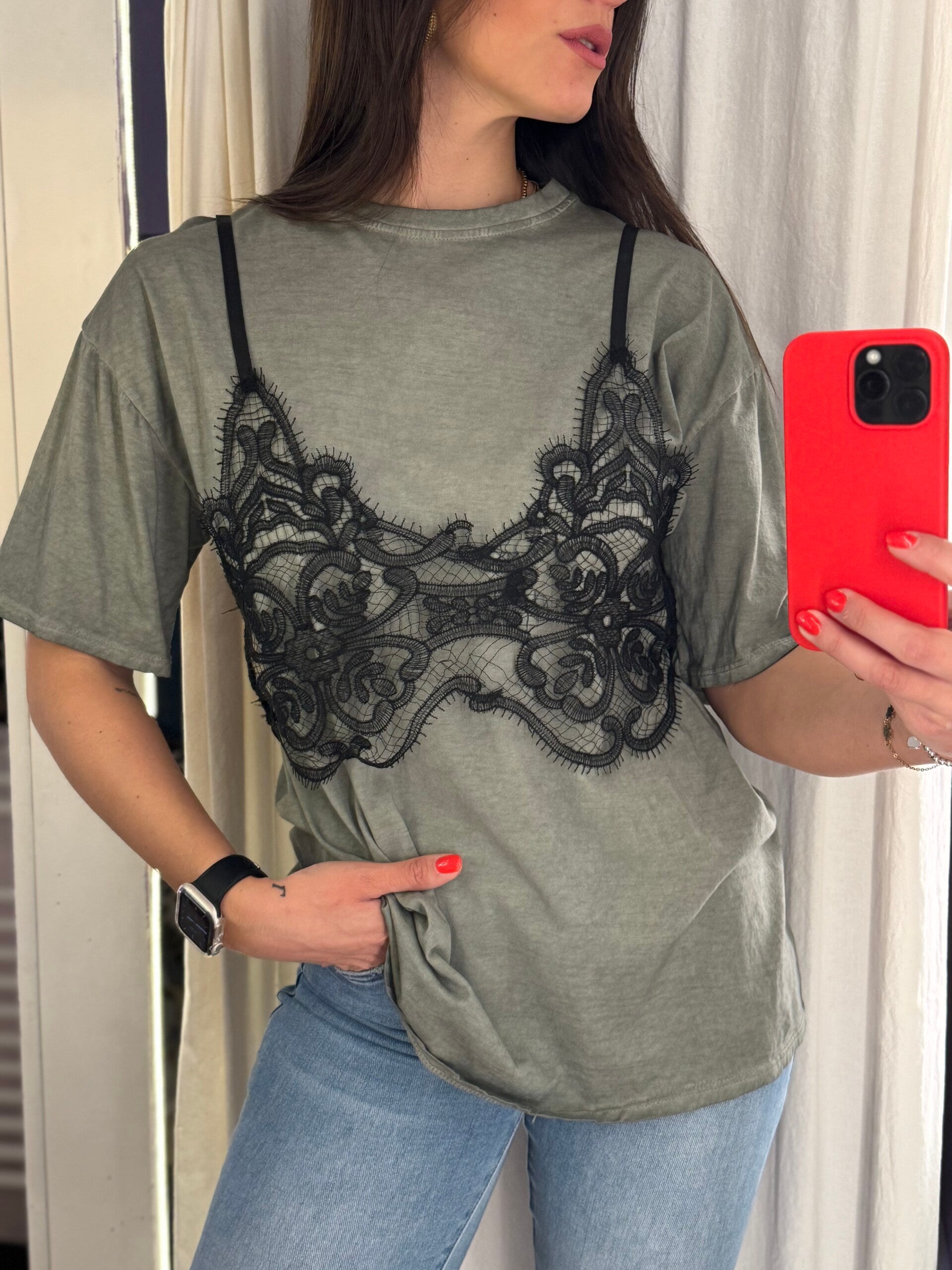 T-shirt basic rivisitata con dettaglio pizzo a contrasto, trendy e super femminile.