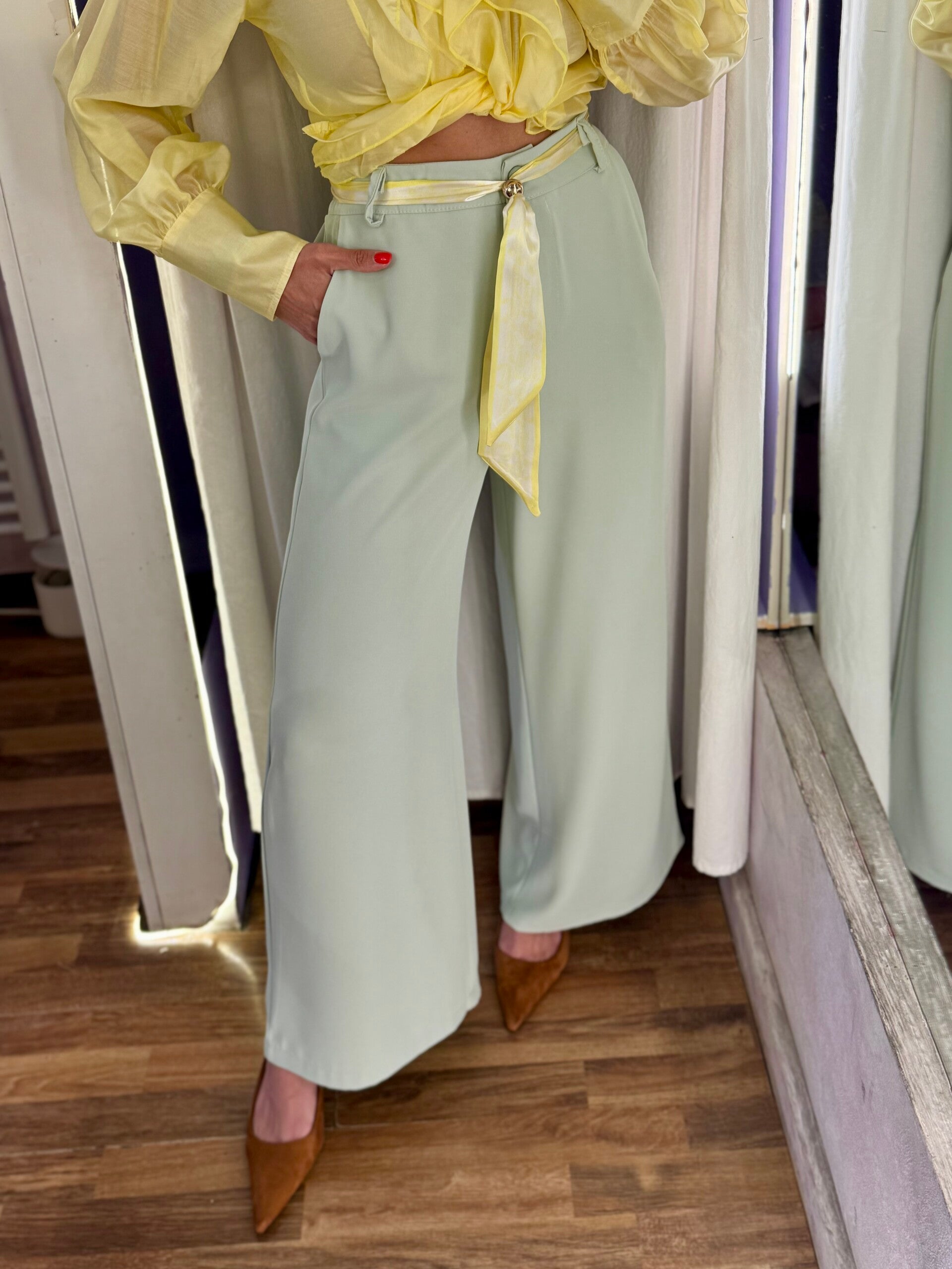 Pantalone fluido a vita alta dal taglio ampio, in una delicata tonalità verde lime. Elegante ma leggero, perfetto per la bella stagione.