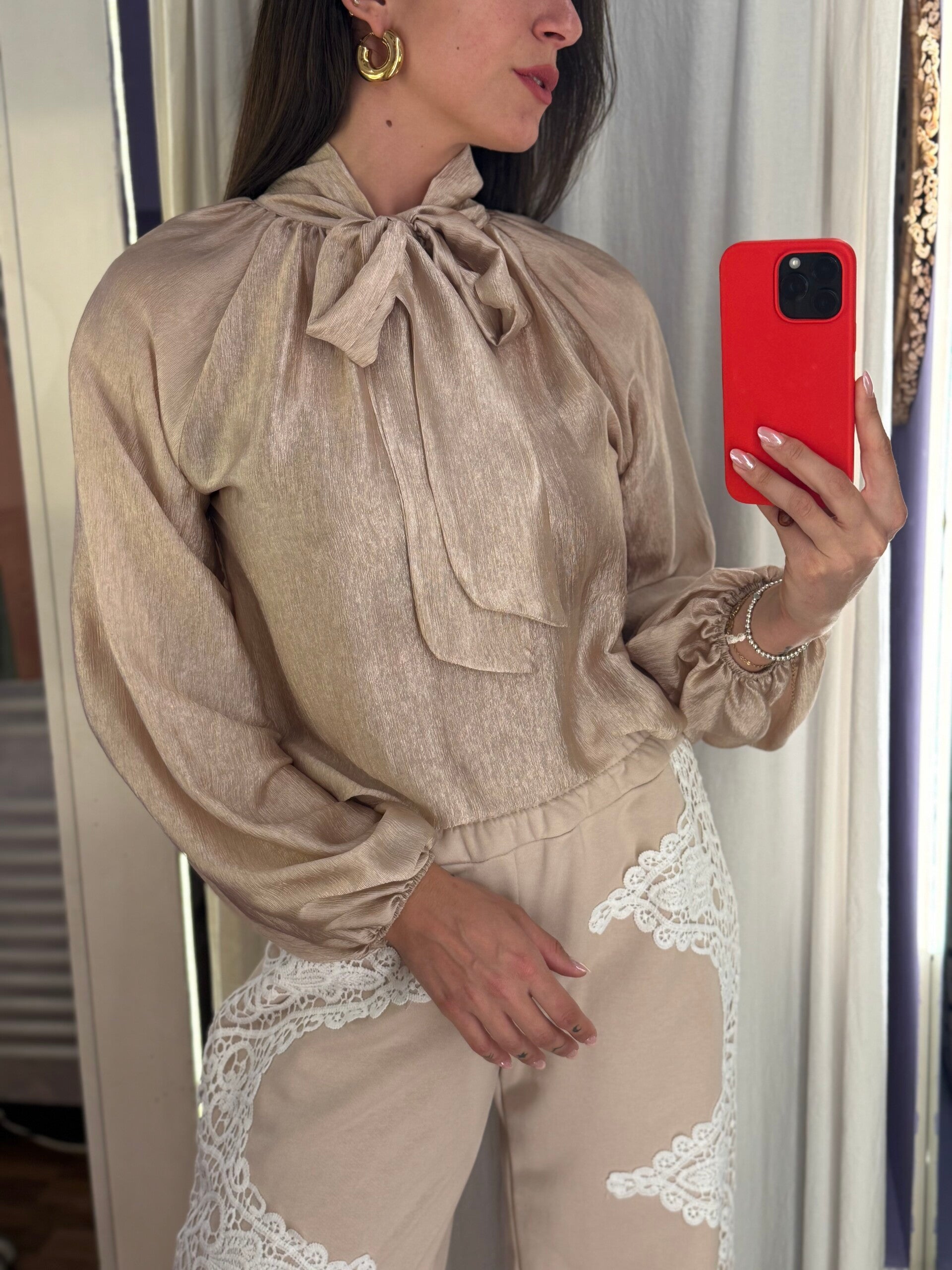 Dettagli:• Tessuto: leggero e fluido• Vestibilità: morbida• Fiocco al collo• Maniche lunghe con elastico• Colore: champagne• Taglia unica